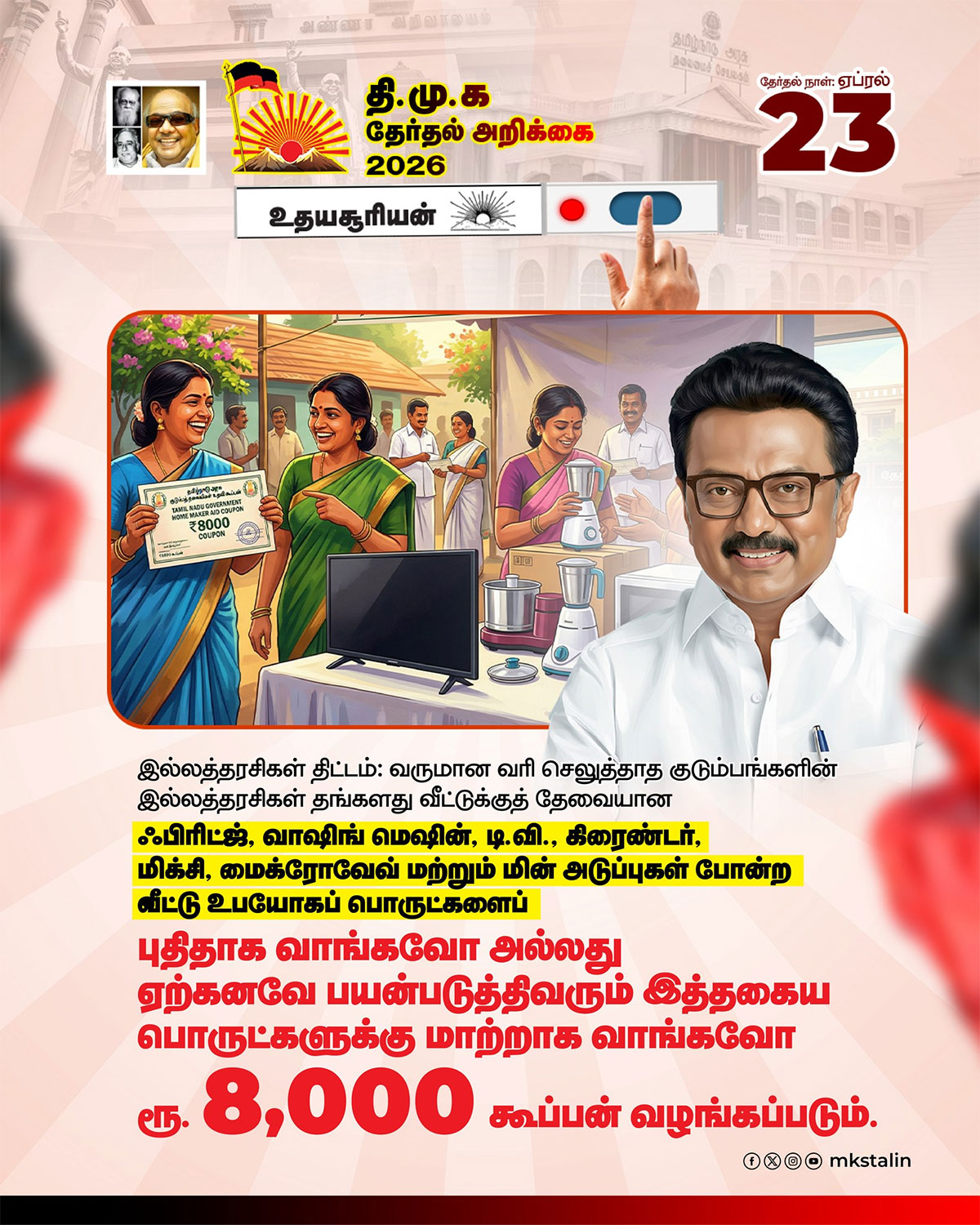 சென்னை: 2026 தமிழ்நாடு சட்டமன்றத் தேர்தலுக்கான தேர்தல் அறிக்கையில், இல்லத்தரசிகளைக் குறிவைத்து ‘இல்லத்தரசி கூப்பன் திட்டம்’ (Illatharasi Coupon Scheme) என்ற புதிய அதிரடித் திட்டத்தை திமுக அறிவித்துள்ளது.